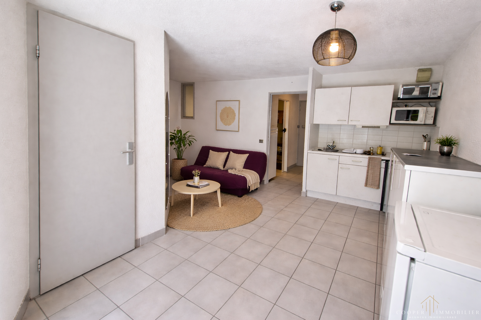 Dès l’entrée, l’appartement offre une configuration optimisée avec une pièce de vie avec cuisine, une chambre, un coin cabine, ainsi qu’une salle d’eau. Un espace fonctionnel, parfaitement adapté à la vie en bord de mer.